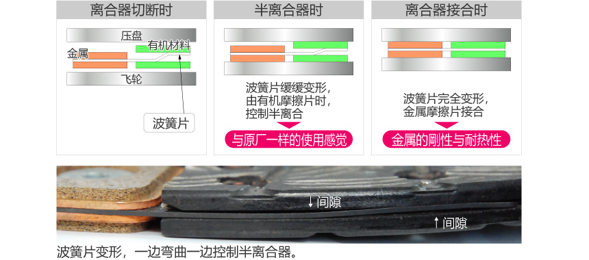 - 通过使用在起步操作舒适度上评价颇高的超级纤维摩擦片来覆盖半离合的领域。通过波簧片的刚性的最佳调节,实现与原厂同等的半离合性能。发挥出超越长久以来赛车离合器的优越操作性能。